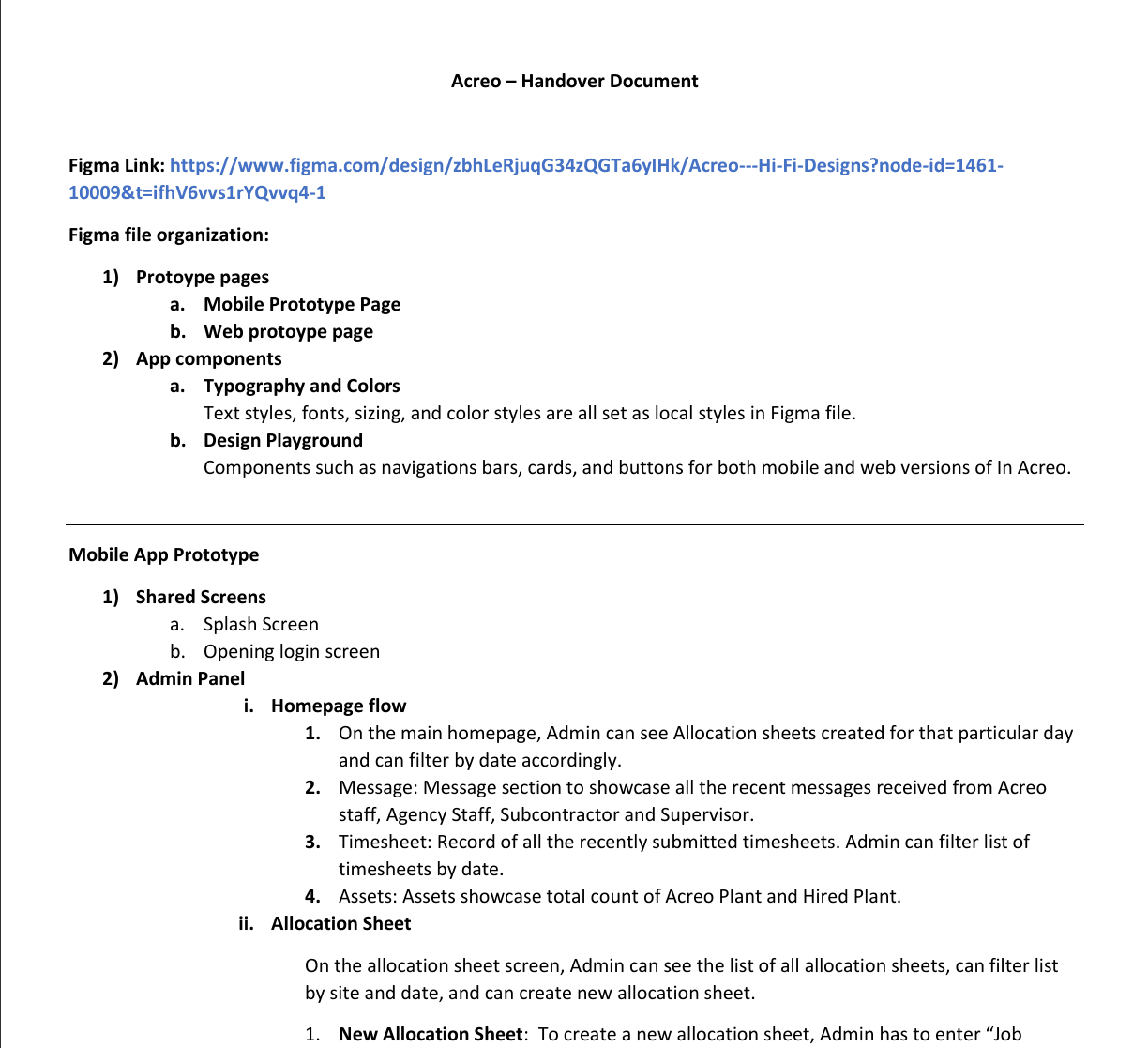A separate handover document was created with added annotations and explanation of each screen. The project handover was made in four phases covering all the core features of Acreo mobile app & admin panel.