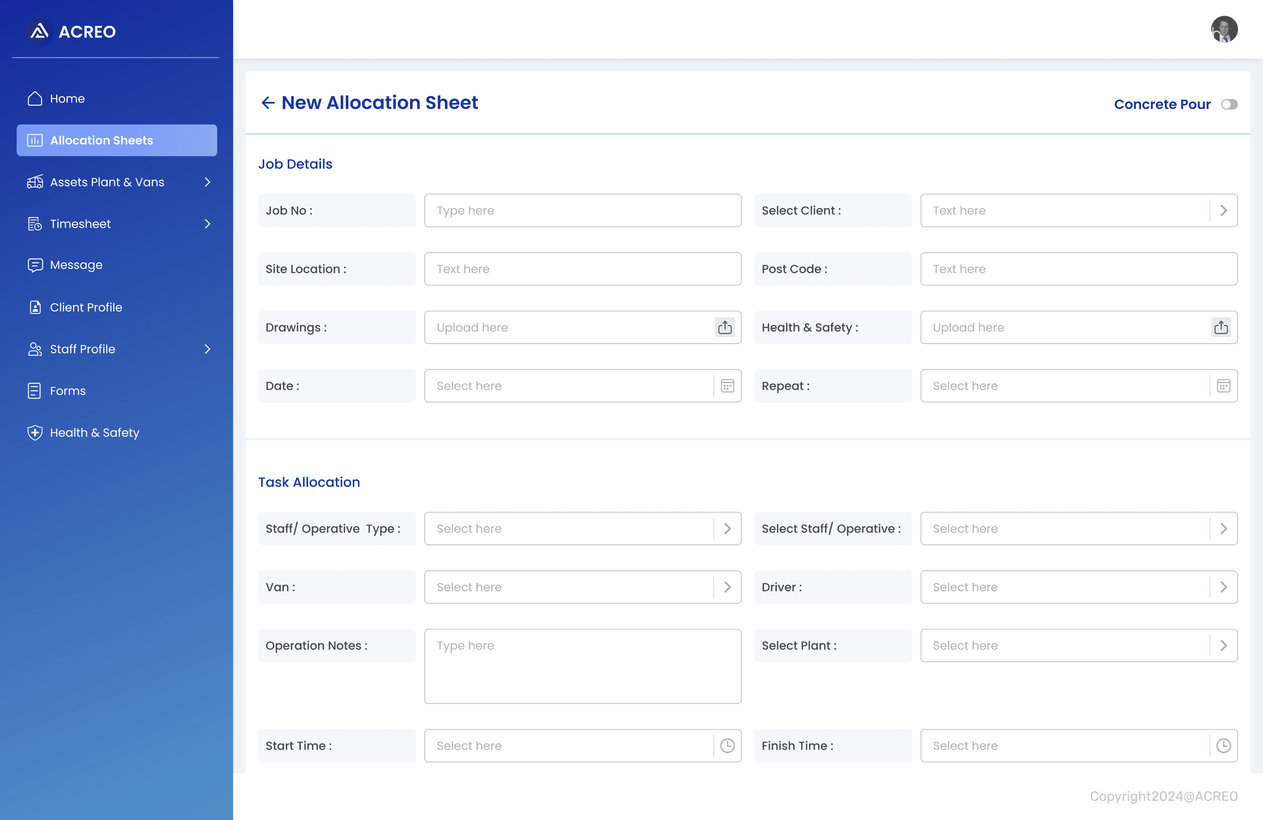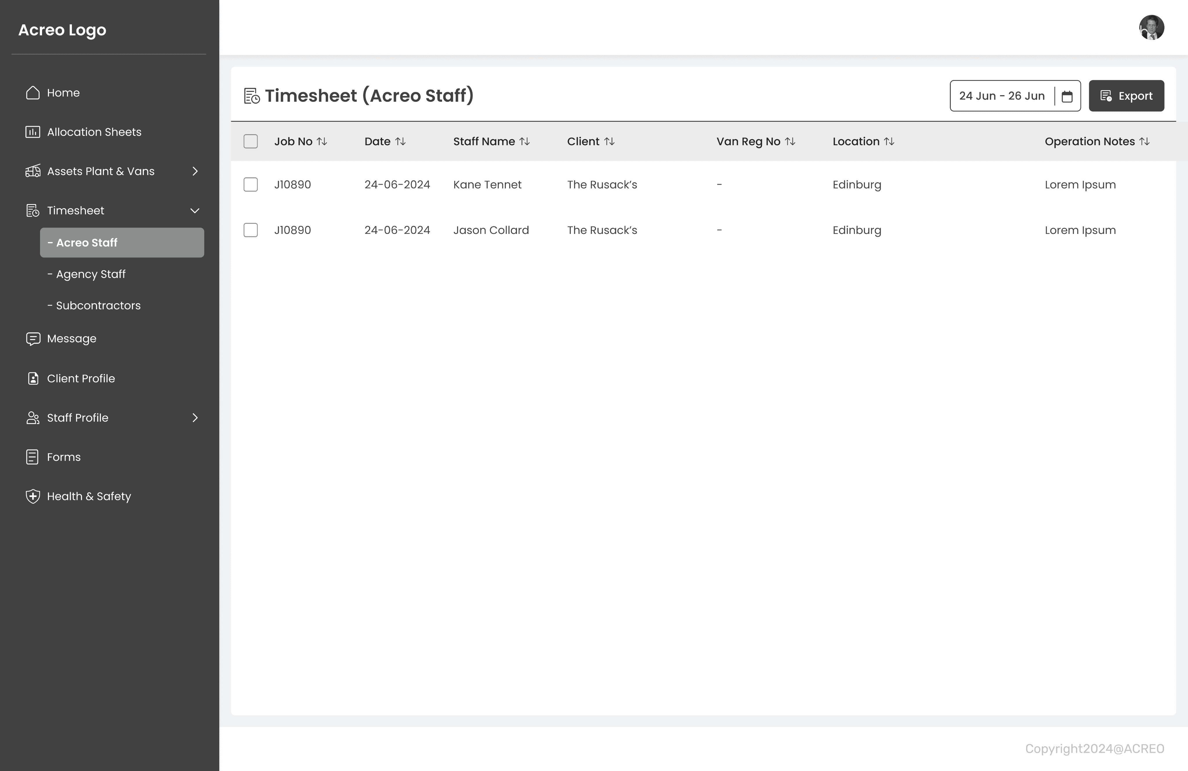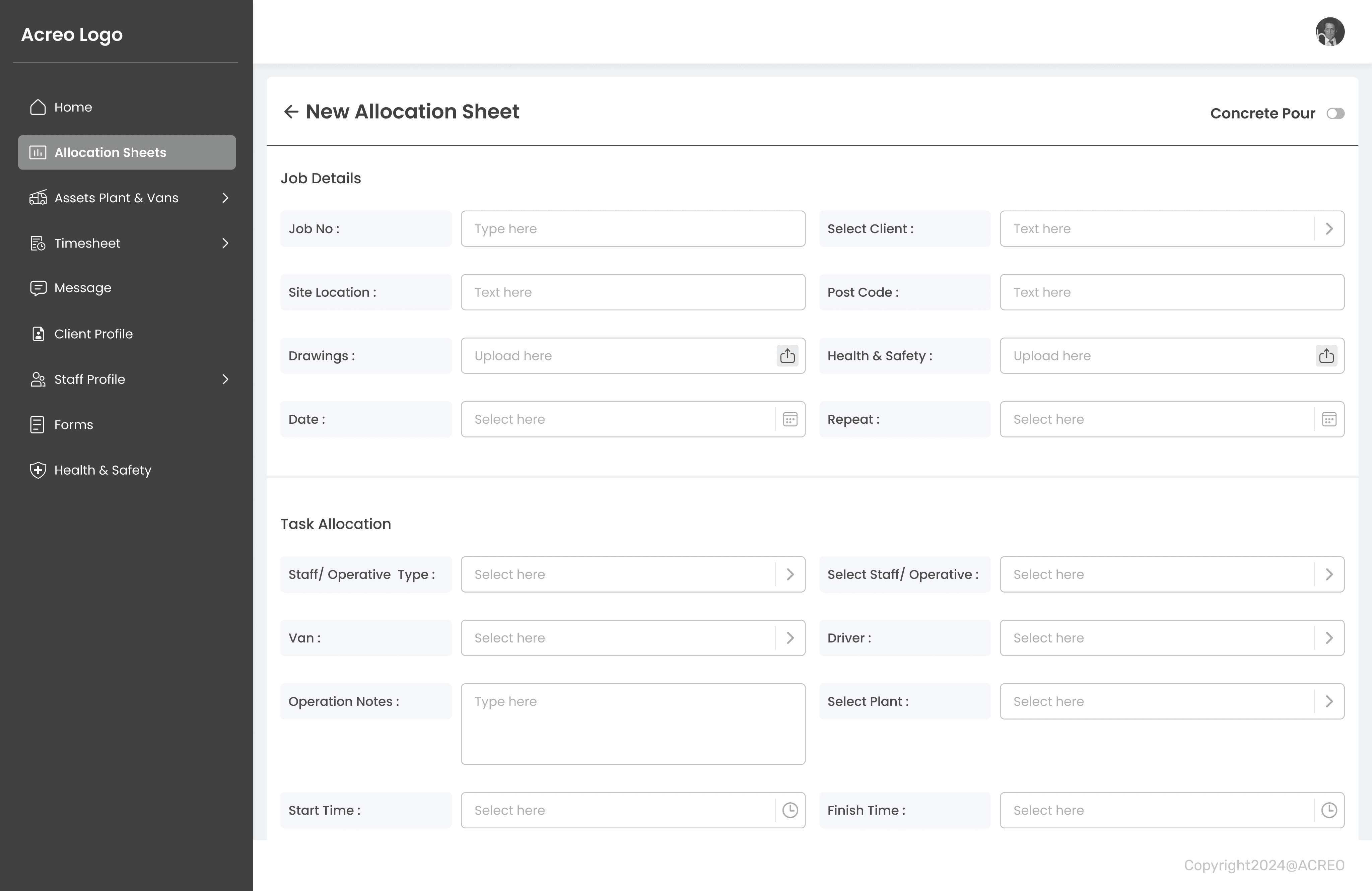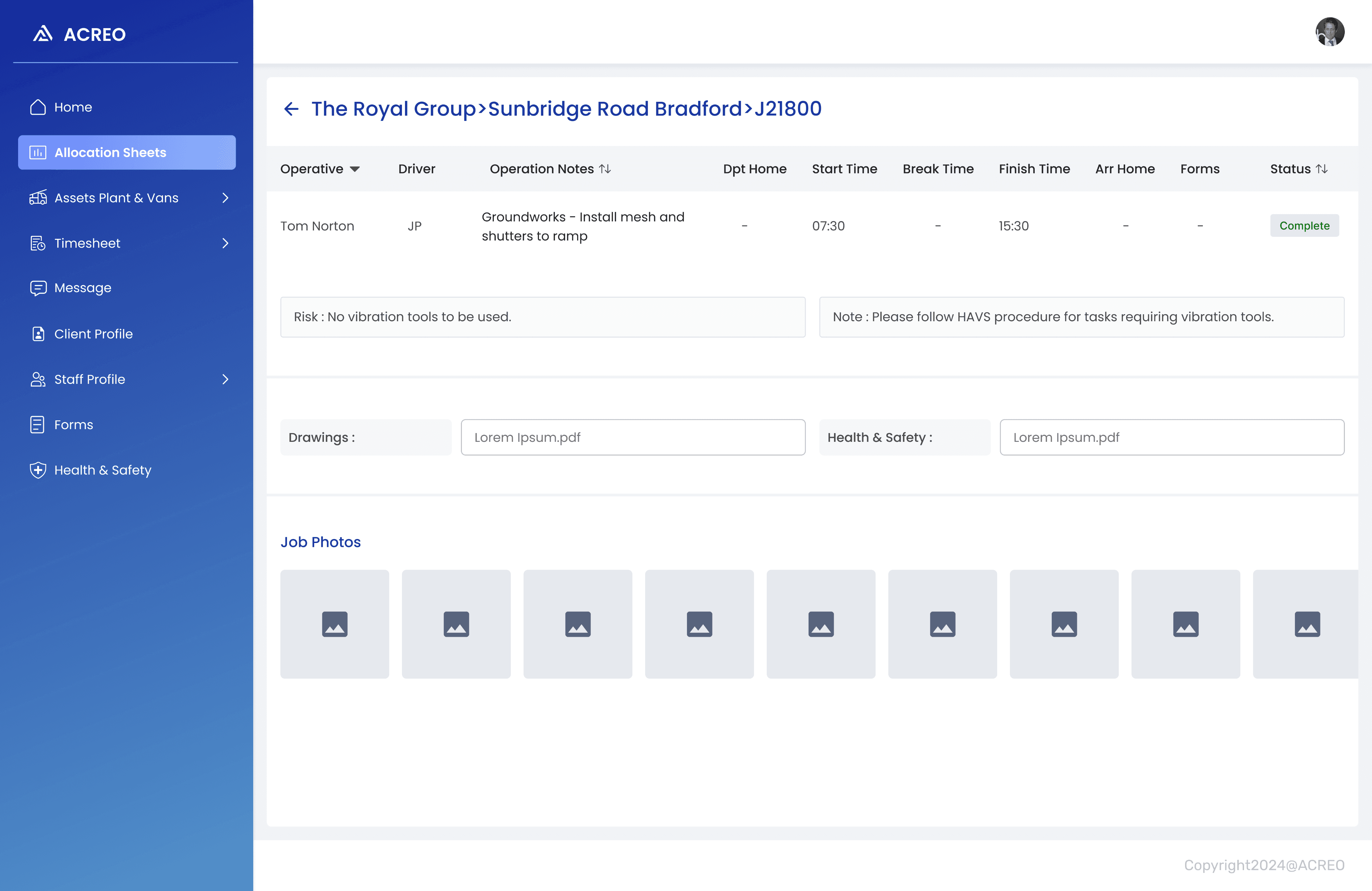 A mobile app for Acreo staff/contractors to digitally complete relevant on-site forms and fill in timesheets and Web App for manager to allocate tasks, forms and process timesheet for payroll.